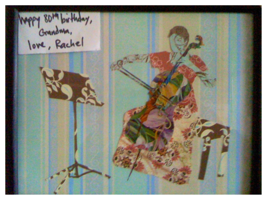 My grandmother was a wonderful cellist, and she loved everything music related, so for her 80th birthday I made her a cellist portrait. I used glossy paper to make up the instrument itself in order to make it pop a little bit.