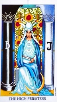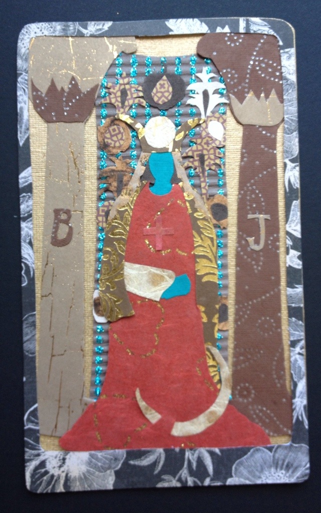 In making this card, I wanted to capture the abundance and splendor that I think exists in everyone’s center, and also because the High Priestess herself seems so royal and in a lush jungle of sorts, so I used a lot of gold, along with bright blue and red and sparkles. I put a muted flowered black frame around it to symbolize the outside, with intuition being a sort of treasure trove within or bright, warm respite from the dark.
